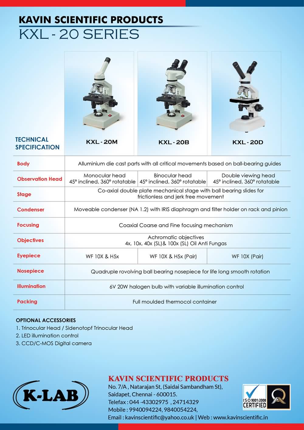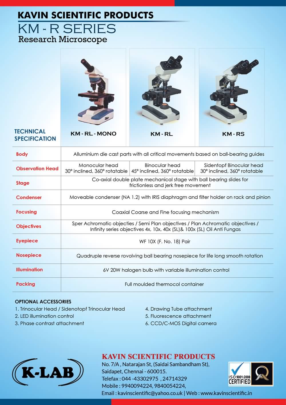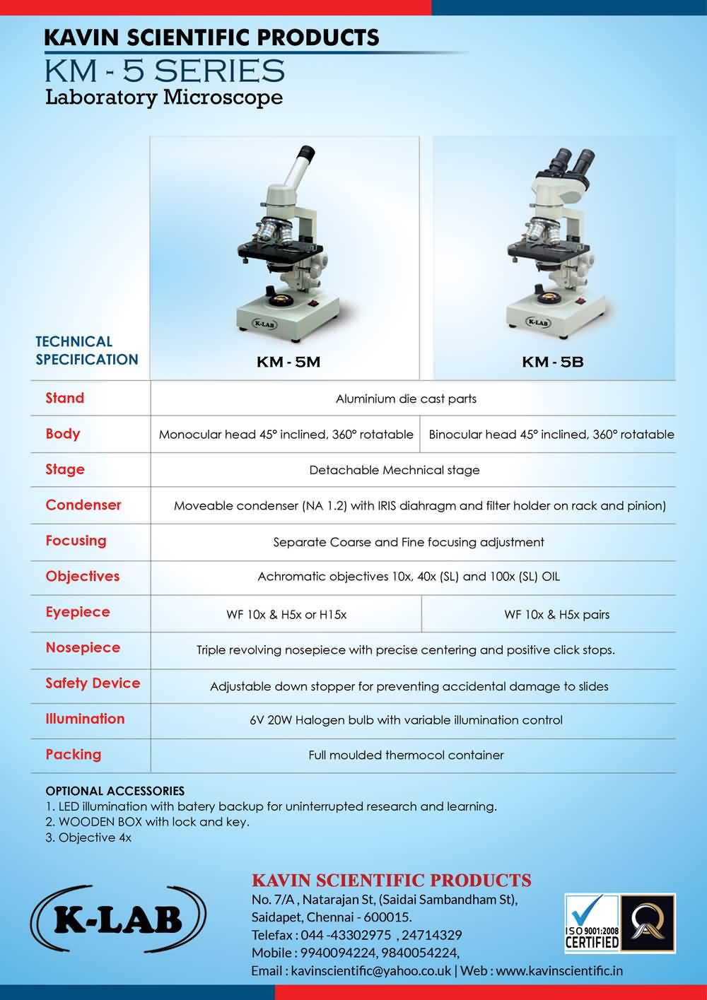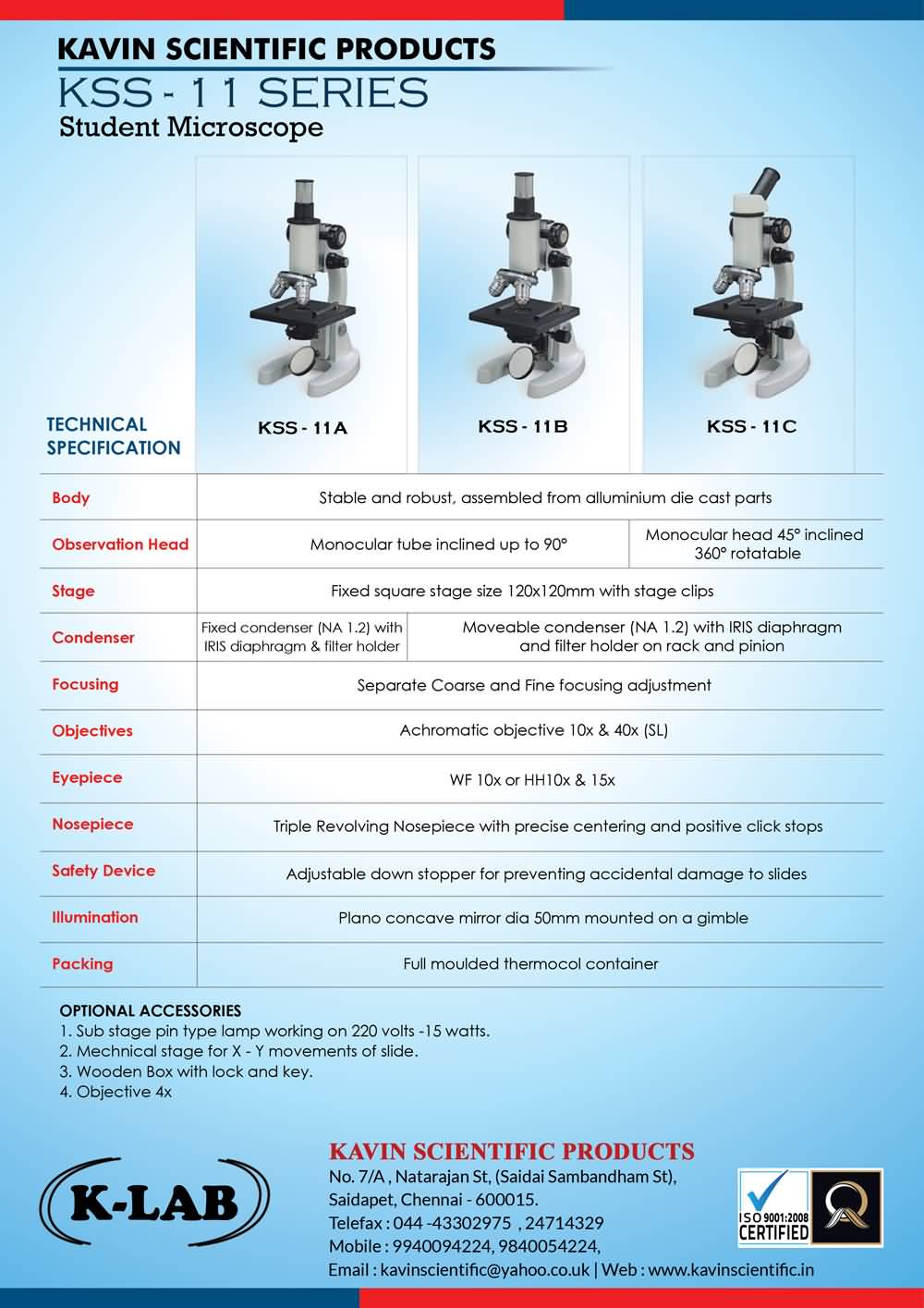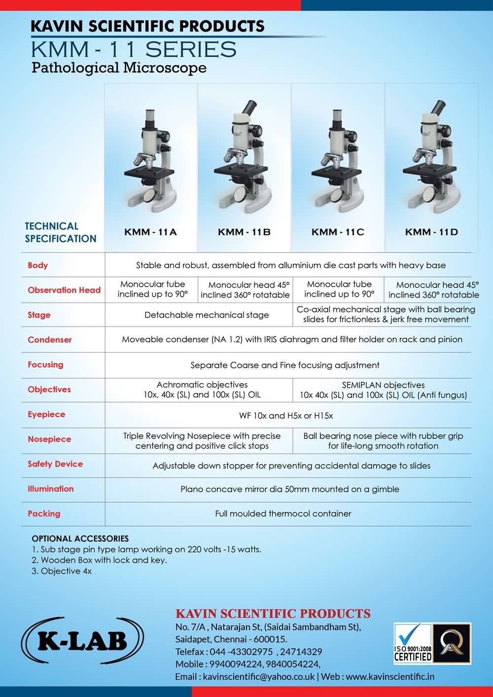 Optional Accessories : 1. Sub stage pin type lamp working on 220 volts -15 watts.